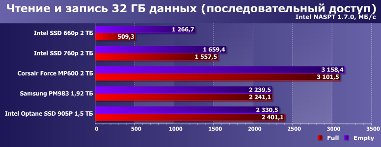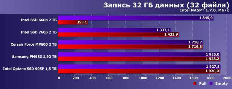 При записи важна память — но и способность контроллера «выжимать» из нее максимум тоже. Или не из нее, а «в обход» — как раз используя SLC-кэширование. Однако последний механизм при недостатке свободного места может... с хрустом сломаться, что хорошо демонстрирует Intel 660p. Порядка 350 МБ/с — как раз предел установленной в него QLC-памяти, что в однобитном режиме можно «разогнать» аж в пять раз. Пока хватает места под кэш — размер которого зависит от общего свободного места.