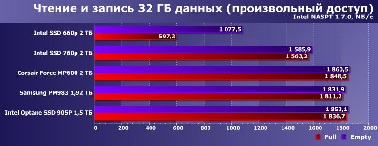 При последовательной записи одновременно с чтением лидером оказывается Corsair MP600. С аутсайдером тоже все понятно. Кстати, кроме всего прочего, этот тест интересен и тем, что его результаты аналогичны удвоенной скорости копирования данных внутри накопителя. И получается, что даже забитый под завязку Intel 660p все равно не хуже, например, любого SATA-накопителя. Как и при многих других нагрузках. Т. е. формула «медленная дешевая память + быстрый контроллер» вообще говоря неплохо работает. По крайней мере, в устройствах высокой емкости.