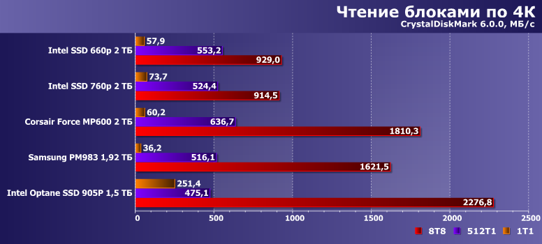На чтении данных, впрочем, кэширование никак не сказывается. Или почти никак — Corsair (как и все накопители на Phison E16) немножко читерит, задерживая свежезаписанные данные в SLC-кэше, откуда они потом и читаются побыстрее. В процессе же заполнения данными эти файлы оттуда вытесняются — вот скорость их чтения процентов на 10 и снижается. Что немного, но «с приборами» заметно. А аутсайдером тут оказывается Intel 660p, но не по вине памяти — просто только у него четырехканальный контроллер, который больше сам по себе «не может».