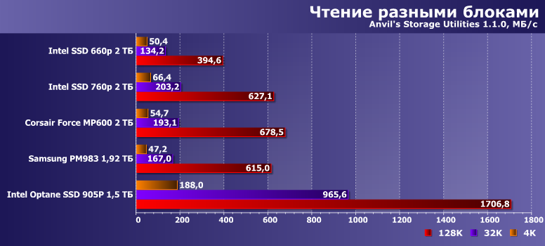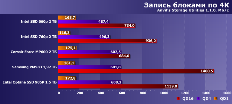 В многопоточном режиме та же история. Остальные участники таких проблем не испытывают. С другой стороны, окажется это «проблемами» или нет — будет сильно зависеть от сценария использования. Не секрет, что для получения высоких скоростей «приема» информации нужен еще быстрый источник. Если, например, мы копируем файл по гигабитной сети — все участники в любом состоянии окажутся одинаково быстрыми, поскольку нужно обеспечить скорость в 100 МБ/с, а больше и не за чем. Если с USB-винчестера или там картовода (сняли видео, привезли домой — сбрасываем на компьютер для обработки) — да тоже никаких проблем. Да и с локального жесткого диска — тоже. Вот если вдруг удалось «собрать» большой объем данных в памяти, а потом его потребовалось сохранить одномоментно — тут уже разница в скорости может оказаться заметной и невооруженным глазом. Равно как и при переносе информации с «основного» на «дополнительный» SSD — если в качестве второго будет использоваться 660p или что-то аналогичное, заметить «тормоза» уже можно. Поэтому мы всегда и говорили, что универсальными эти устройства не являются. Но, с учетом цены и того, что проблемы могут возникать, а не будут гарантированными и регулярными — на это можно и закрыть глаза. Или не закрывать — а сразу ориентироваться на накопитель более высокого класса.