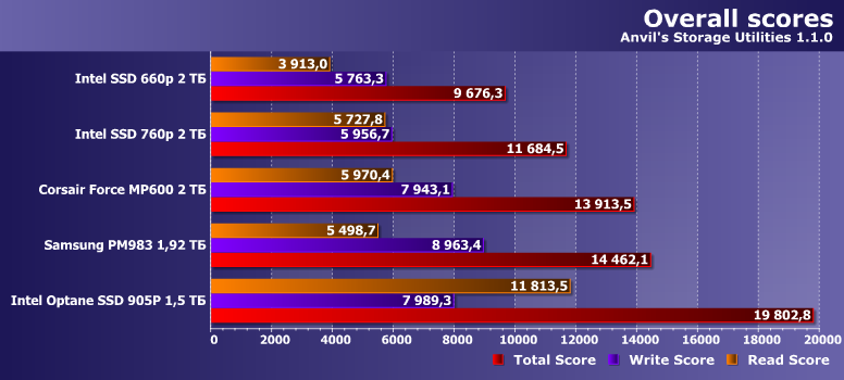 Общая оценка в попугаях этой программы, казалось бы, однозначно голосует за Optane SSD. Однако хорошо заметно, что выходит такое за счет операций чтения — тут есть обобщенное преимущество в пару раз. Внезапно близкое к оценкам PCMark 10 — что не удивительно. Но на записи эти накопители могут даже проиграть SSD на флэш-памяти, а стоят радикально дороже. Поэтому разумным и универсальным вариантом по совокупности факторов являются «середнячки» на TLC-памяти. Или, даже, можно подвинуться по скорости — и купить более дешевый SSD на QLC NAND. Но в некоторых сценариях «двигаться» придется заметно, так что универсальность такого решения гораздо ниже.