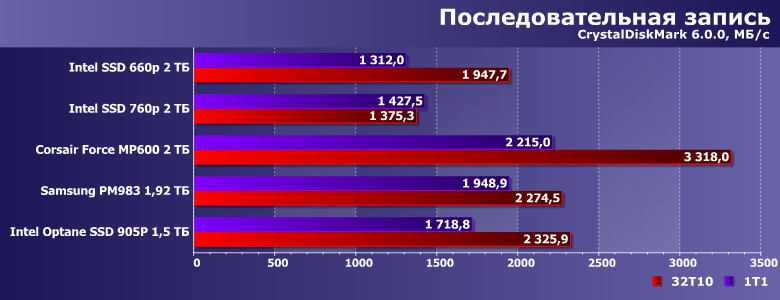 Что же касается записи, то для многобитного флэша это процесс до сих пор не простой. С чем в потребительском сегменте принято бороться SLC-кэшированием — и успешно «побеждать» низкоуровневые утилиты, оперирующие небольшими количествами данных. Так что, если не выходить за их пределы, внезапно и QLC NAND оказывается отличным носителем. Не идеальным — но соотношения скоростей в паре 660p/760p наводят на мысли. А в серверных накопителях кэширование как правило не используется — нет в таком окружении необходимости в высоких пиковых скоростях, зато встречается долгая «тяжелая» запись, так что SLC-кэш не только бесполезен, но и немного вреден. Тем более, TLC большой емкости позволяет получать высокие скорости стабильно и безо всяких ухищрений. С ухищрениями — некоторое время можно обеспечивать и очень высокие, что нам демонстрирует Corsair (да и все прочие SSD на Phison E16 с емкостью 1 и 2 ТБ — в этом плане они все одинаковые). А Optane SSD в очередной раз выглядит бледно — очень быстрая память в паре с не очень быстрым контроллером (к тому же, вовсе рассчитанным на другие нагрузки) «раскрыться» не может.