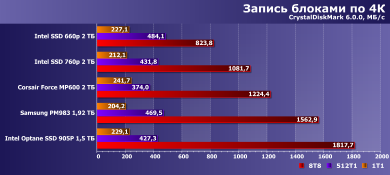 Ситуация повторяется. С поправкой на то, что в этой утилите мы работаем с более короткими очередями. Так что на операциях чтения собственные задержки памяти еще успевают сказаться. А вот при записи они в любом случае не мешают — если, конечно, не заниматься ей сутками напролет.