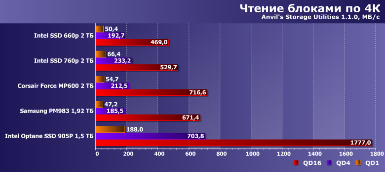 Но без памяти с низкими задержками невозможно обойтись при произвольном доступе «без очереди». Точнее, без нее в таком сценарии невозможно получить высокие результаты, поскольку «играет» только собственная латентность носителя. Разные варианты флэша в этом плане тоже могут отличаться, но плюс-минус в пару раз. У Optane SSD результаты попросту другого порядка. Поэтому, если обращать внимание только на 4К с единичными или более короткими очередями — на этом сравнение можно прекращать. Тем более, что более длинных очередей в персональных сценариях и не бывает. И именно с этим связаны очень высокие результаты «оптановых» в PCMark 10 — пусть там уже и не порядок, но очень весомые два раза. Правда при еще более весомой разнице в цене — 2 ТБ флэша тоже, мягко говоря, не копейки, но посильно многим, а «кроспойнта» на эти деньги хорошо, если 280 ГБ купить получится.