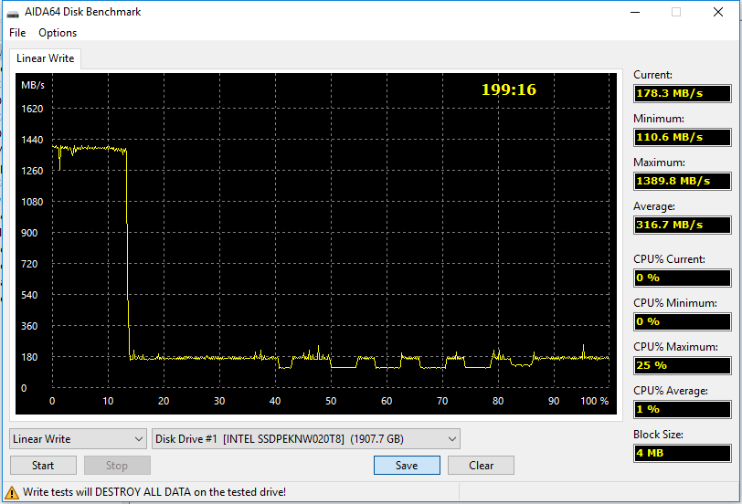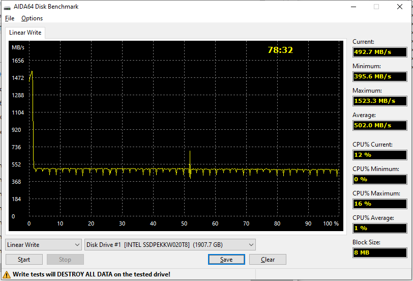 При этом на скорости использование дорогих «мелких» кристаллов памяти никак не сказывается: максимум возможностей SM2262 раскрывался с такими кристаллами уже и на емкости в 512 ГБ. Дальше — только сама по себе емкость увеличивалась. А графики полной прописи данными практически идентичны: порядка 1,5 ГБ/с в SLC-кэш и в три раза меньше за его пределами. Последнее, впрочем, может быть вызвано и какими-то проблемами совместимости AIDA64, поскольку другие утилиты рапортуют о примерно гигабайте в секунду — но и последнее значение с точки зрения современности воображение уже не поражает.