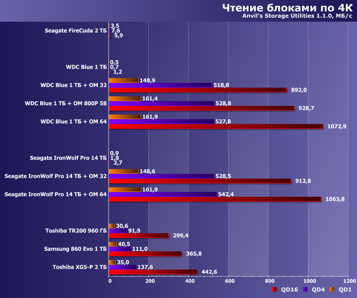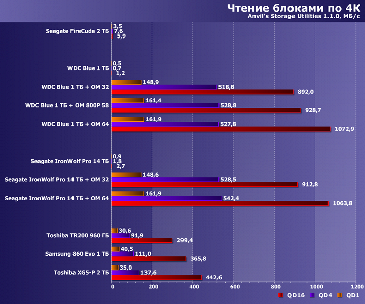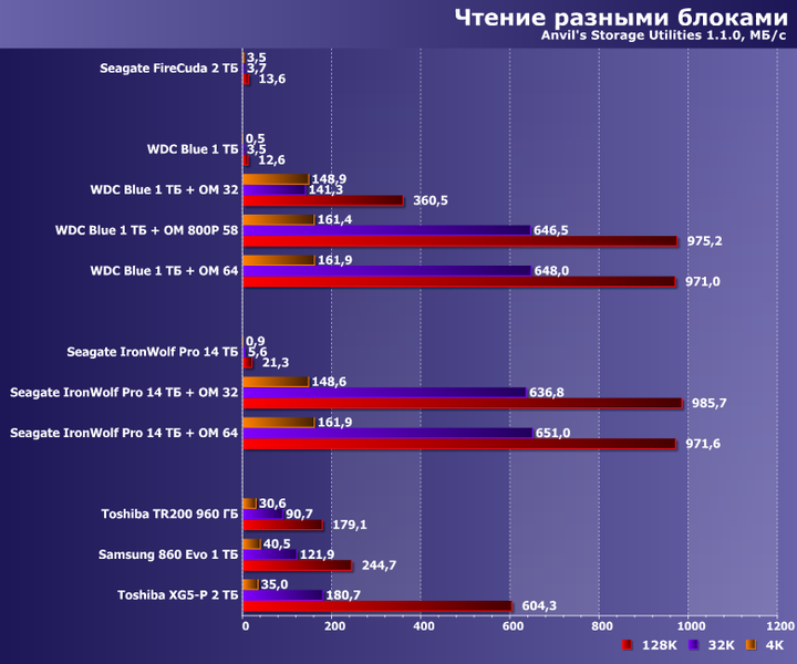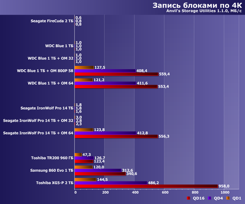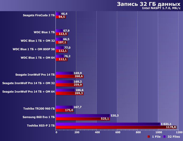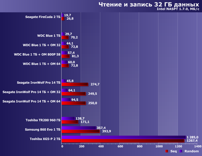 Специфика работы низкоуровневых утилит такова, что «рабочий» файл они создают непосредственно перед использованием — так что с большой вероятностью он окажется именно в кэше. В итоге до самого винчестера есть шансы не добраться, причем операции чтения ускоряются уже и на модулях по 32 ГБ, а вот для того, чтобы «инкапсулировать» всю запись требуется порядка 60 ГБ. Во всяком случае, при выбранном нами «рабочем объеме» в 16 ГБ — «умолчальный» для этих утилит 1 ГБ позволит наслаждаться высоким количеством попугаев и владельцев модулей на 16 ГБ :)