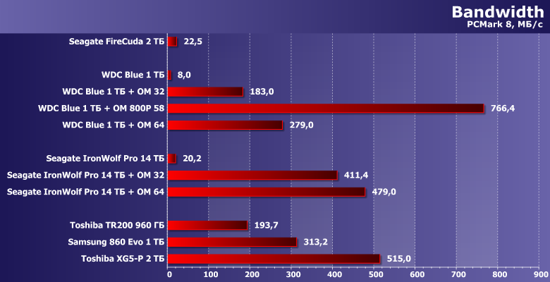 Механизм понятен — кэширующий модуль старается взять на себя как можно больше дисковых операций. Ну а поскольку сам он представляет собой тот же SSD, причем очень быстрый, в случае успеха все работает очень быстро. Но не гарантировано — именно поэтому низкоуровневый результат PCMark 8 находится на уровне SSD среднего (или, даже, низкого) класса, да и зависит от ускоряемого винчестера. Причем как правило даже сильнее, чем от модуля — если не считать выдающихся показателей Optane SSD 800P 58 ГБ при подобном нецелевом использовании.
