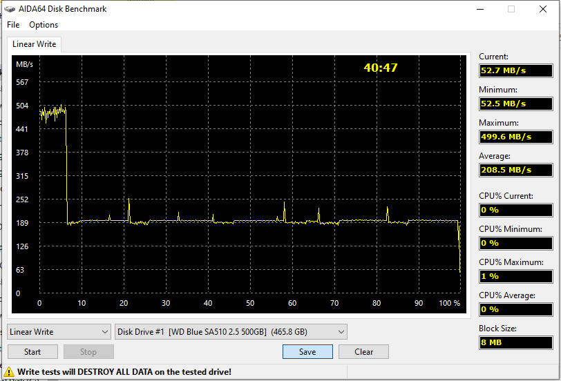 Но можно считать, что мы просто придираемся — выискивая такие нюансы на однозначно быстрых накопителях. Поскольку вот так работает WD Blue SA510. Какие там колебания между 400 и 500 МБ/с — на большей части емкости нет и 200 МБ/с. Но это, повторимся, не самое страшное — хуже когда многие бюджетные модели проваливаются ниже 100 МБ/с. То есть оказываются медленнее (хотя бы в этой дисциплине) жестких дисков. SA510 по крайней мере стабильно быстрее ноутбучных винчестеров. Да и вообще достаточно стабилен, не слишком завязываясь на SLC-кэш.