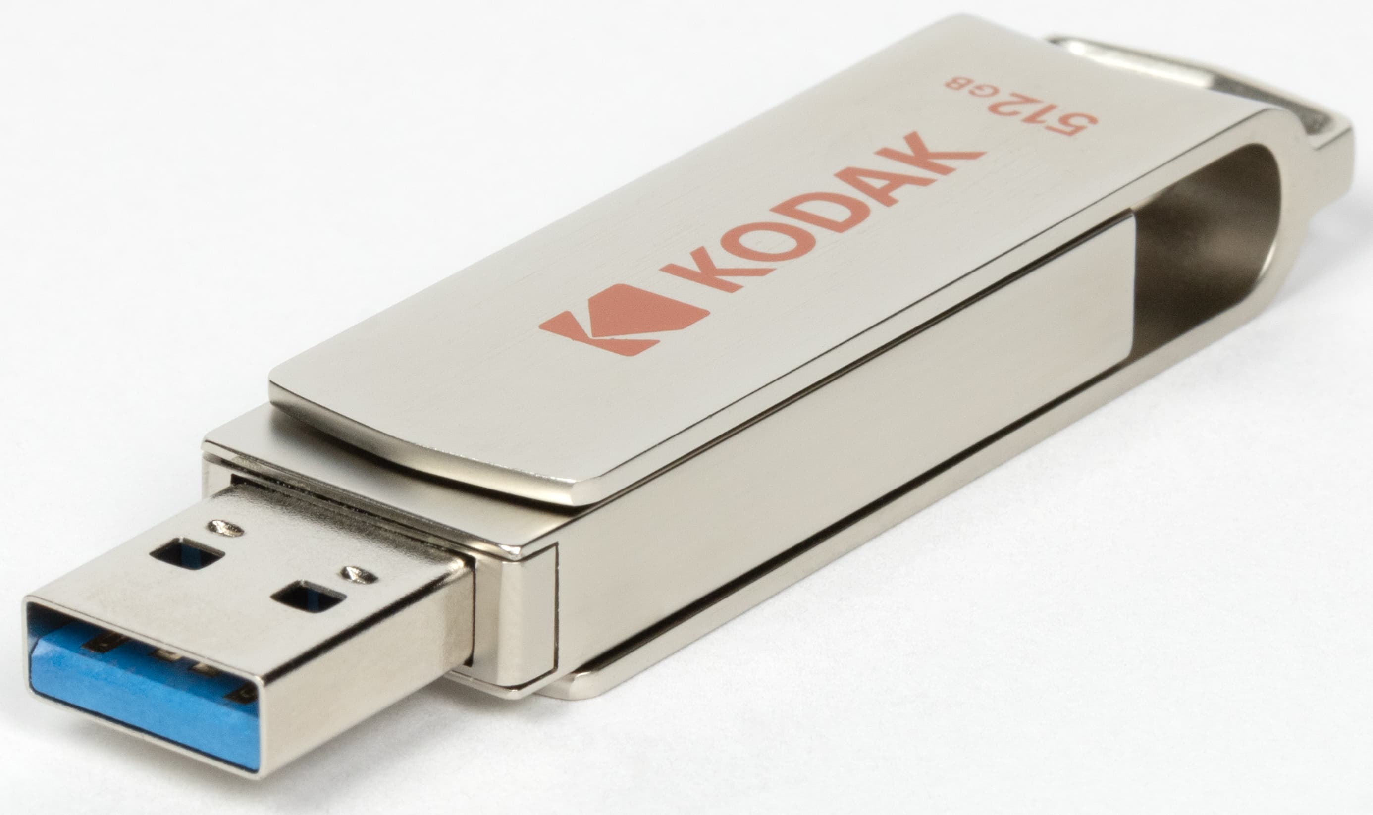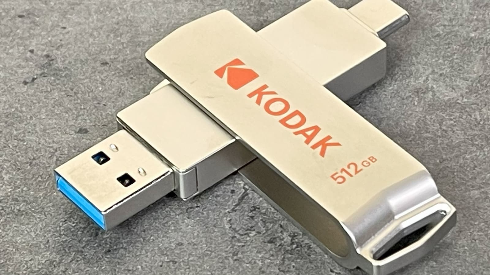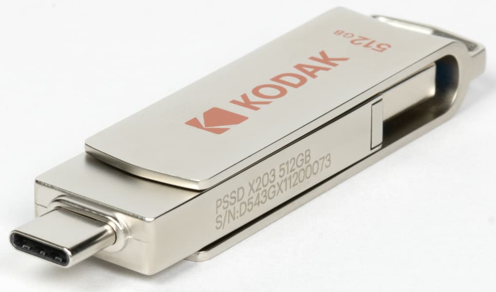 Это всё мы уже рассказывали, когда весной тестировали терабайтный Kodak Portable SSD X200. Несмотря на сходство названий, это немного разные внешне продукты. Х200 — типичный внешний SSD в виде коробочки размерами 91×45×10 мм и массой 35 г с кабелем, а X203 провода не нужны, поскольку он выглядит как обычная флэшка и укладывается в 70×16×9,7 мм и 26,6 г, несмотря на металлический корпус. Точнее, как флэшка до сих пор не совсем обычная, а снабженная USB-разъемами обоих актуальных типов. Мы вообще считаем, что на сегодняшнем переходном этапе такими должны быть все модели, но производители так пока не считают. Поэтому и нам пришлось наступить на горло собственной песне, вернув в тестирования «одностандартные» флэшки (иначе пришлось бы проигнорировать некоторое количество интересных устройств), но к конструкции X203 у нас претензий нет. Ну, разве что разъемы ничем не защищены от грязи, а поворотная металлическая скоба лишь ухудшает ситуацию с загрязнением и без толку увеличивает вес устройства. Но сам по себе такой дизайн популярен, покупателей не раздражает (как минимум, часть покупателей). И поскольку вариантов внешнего исполнения на рынке представлено много, то, значит, одного удобного для всех так за десятилетия и не удалось придумать: у всех свои достоинства и недостатки.