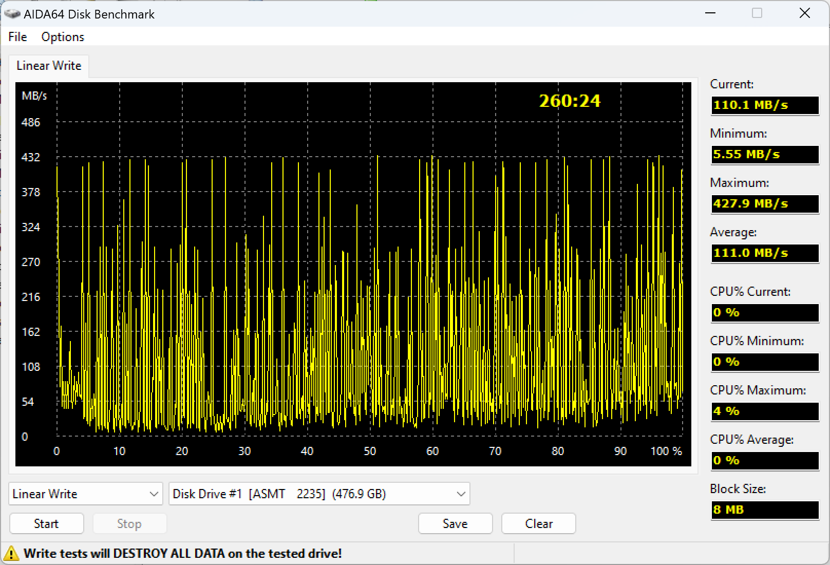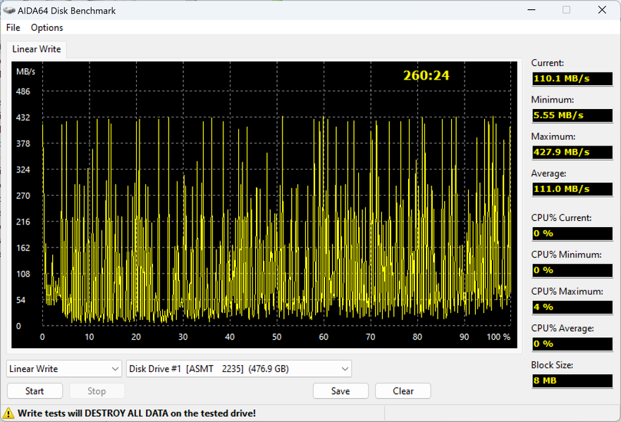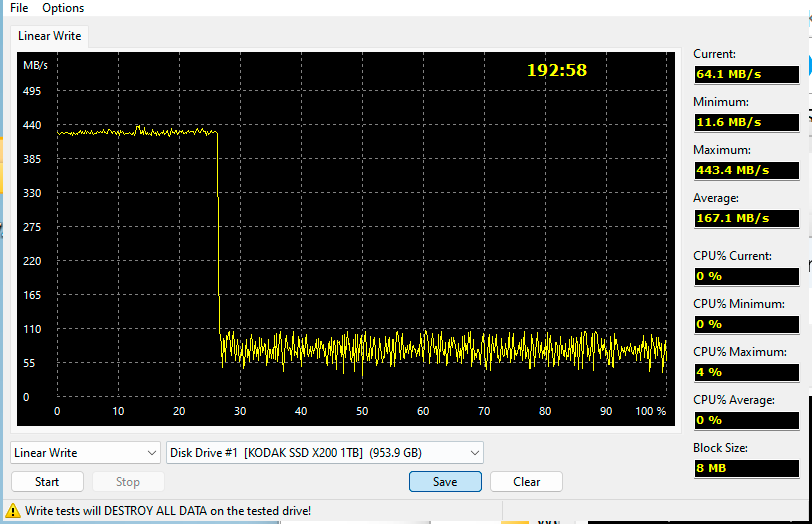 На первый взгляд всё не так уж страшно. Почти два часа времени на запись всего полтерабайта — это много, равно как и провалы ниже 30 МБ/с, однако производители бюджетных SATA SSD к таким ужасам нас всех уже приучили. Зато хотя бы четверть свободного места можно записать быстро. В теории.