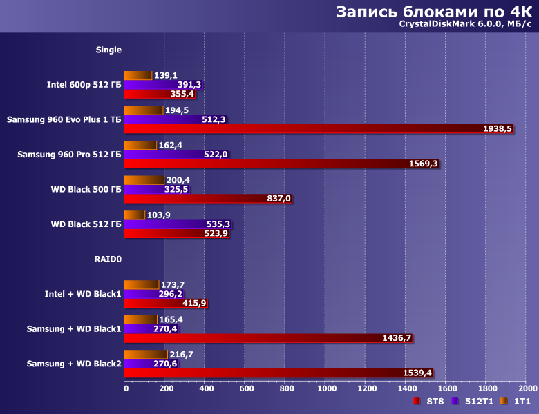 Довольно любопытная картинка — с одной стороны, массив, хотя бы, ничего не портит, с другой — практически ничего и не дает. Понятно почему — в этом сценарии вообще очень сложно разделить накопители на «быстрые» и «медленные». А учитывая то, что в прикладном ПО подобных операций немало, нет ничего удивительно и в том, что разные (иногда даже существенно-разные) SSD в бенчмарках высокого уровня ведут себя одинаково.