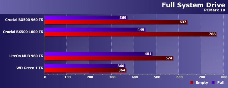 Новый комплексный PCMark 10 Full System Drive ориентирован на твердотельные накопители, так что способен загрузить работой даже самые быстрые SSD, не говоря уже о бюджетных. И включает в себя самые разные нагрузки — от запуска приложений, до простого копирования данных, так что дает полную информацию об усредненной «системной» производительностью SSD. Более подробную информацию можно получить из нашего краткого описания теста по ссылке, а сейчас — просто результаты. Как обычно — в двух состояниях: когда на SSD данных нет вообще (и SLC-кэширование может развернуться в полную силу) и когда на нем остается всего 100 ГБ свободного места (что куда более приближено к реальности, поскольку нынешние цены пока еще не слишком располагают к выбору емкости «с запасом»).
