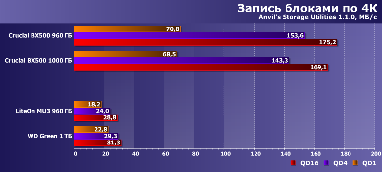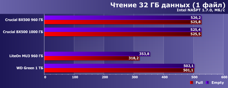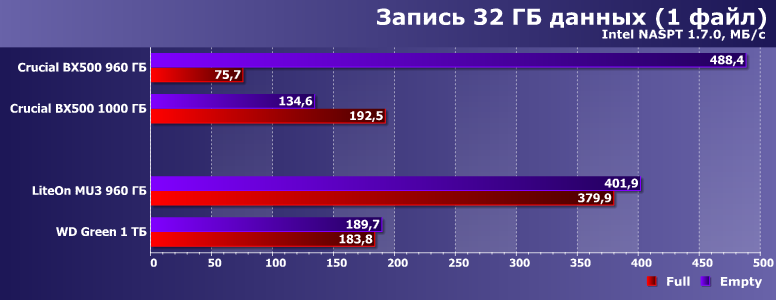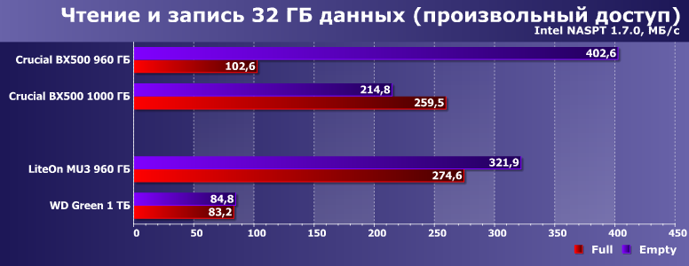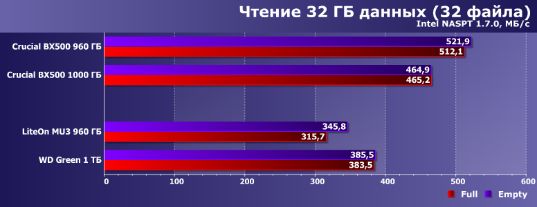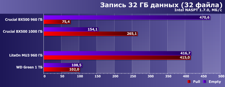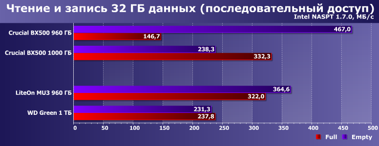 А тут настал звездный час Crucial BX500, причем непонятно — какая из двух модификаций более «звезданутая». Новая на QLC работает на уровне WD Green, а то и хуже. Старая на TLC умудрялась всех побеждать при больших запасах SLC-кэша — зато проигрывает не только лишь всем, а еще и жестким дискам нередко, когда запаса места нет. В общем, как только дело доходит до записи, так все молодцы. Особенно когда удаль молодецкую не удается замаскировать программными ухищрениями.