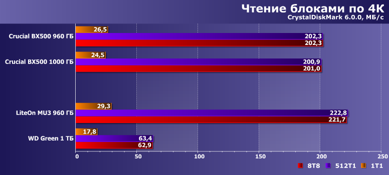 Отметим, что, вопреки существующим стереотипам, в программном обеспечении немалый объем работы приходится и на блоки, отличные от 4К — иногда даже меньшие, и очень часто — большие. А тут разница между испытуемыми вообще сокращается.