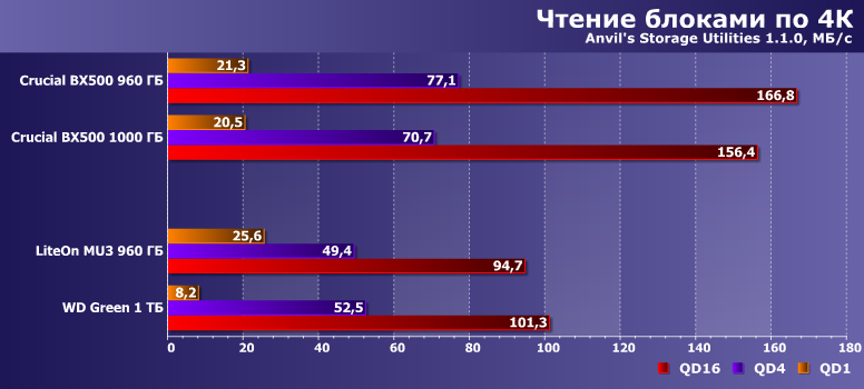 На «коротких» же очередях Green иногда оказывается даже не последним. Не потому, что так уж хорош — просто сегмент такой. В котором в жертву низкой себестоимости производители готовы принести все — хоть память, хоть контроллеры. Если же покупатель на такие жертвы идти не готов, значит он просто не туда забрел.