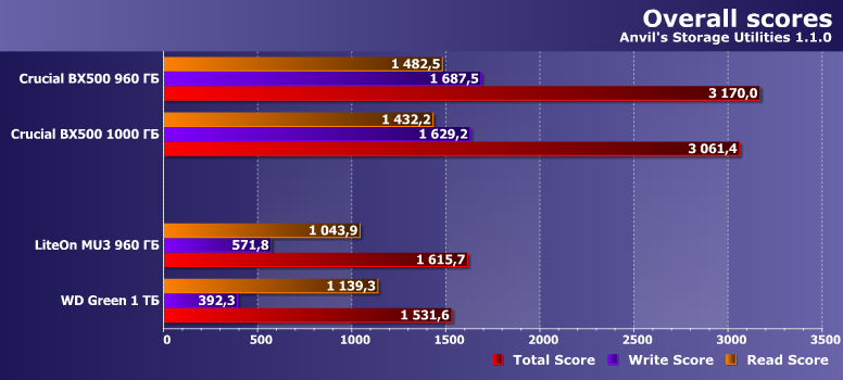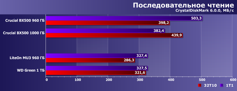 В данном случае можно ничего не придумывать, а просто взять две версии (QLC и TLC) Crucial BX500 из предыдущего материала. Можно было бы добавить к ним и что-нибудь более высокого уровня, но там уже глаза разбегаются: например, WD практически за одинаковые деньги продает и Blue 3D, и Blue SN550 на 1 ТБ. Второй в современной системе более предпочтителен, поскольку существенно быстрее — но тут уже сравнивать производительность не стоит даже и начинать. К тому же совместимости с SATA у него нет, а она иногда требуется. Значит, Blue 3D как 100% альтернатива — но тогда тоже не слишком интересно сравнивать скорости, поскольку если они действительно очень нужны, то лучше SN550. В любом случае, повторимся, наше мнение — лучше по возможности сразу же рассматривать накопители среднего уровня. Бюджетные нужны в специфических случаях — либо когда есть непреодолимое желание сэкономить хоть что-то, но не ценой емкости. Из чего следует, что такие устройства имеет смысл сравнивать только друг с другом — дабы в куче сора найти самый большой алмаз (предполагая, что он там есть).