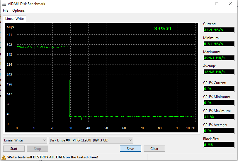 Нам, впрочем, повезло — купленный терабайтный Green оказался таким же, как и ранее приобретенные 120 и 240 ГБ. Так что собственные характеристики памяти тут (по меркам бюджетного сегмента) неплохи — всем бы так. Другое дело, что контроллер неспособен распорядиться этим богатством по назначению даже в простых сценариях, но, по крайней мере, никаких жутких провалов скорости записи не наблюдается. В остальных случаях — посмотрим.
