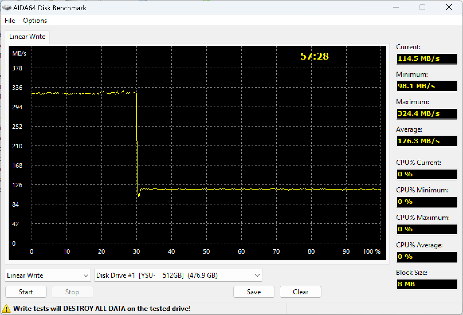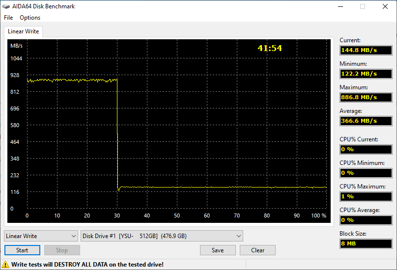 Первый график — как оно должно быть, второй — как оно, к сожалению, нередко бывает. Заметно, что «тормоза» непропорциональны: основная часть диска записывается в любом случае медленнее 150 МБ/с (был бы терабайт — могли бы до 200 МБ/с подняться, но не выше). Впрочем, на четверть скорость все-таки отличается, что немаловажно, когда ее не хватает. Зато пиковая скорость отличается вообще почти в три раза. В штатном режиме флэшка работает даже быстрее, чем обещал производитель, а в «неправильном» будет отставать даже от моделей с мостом USB—SATA. Но всё это — лишь пока не кончится кэш.