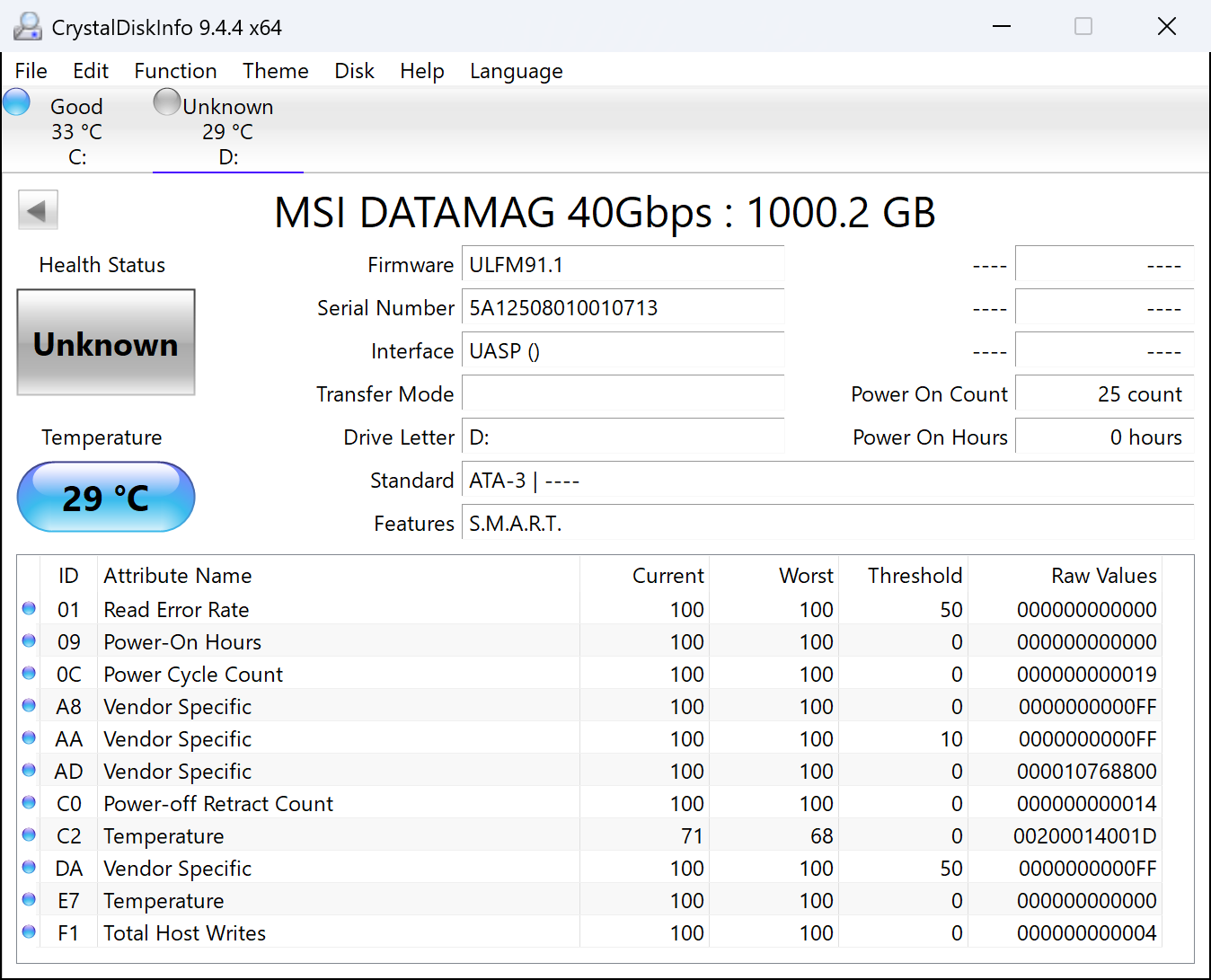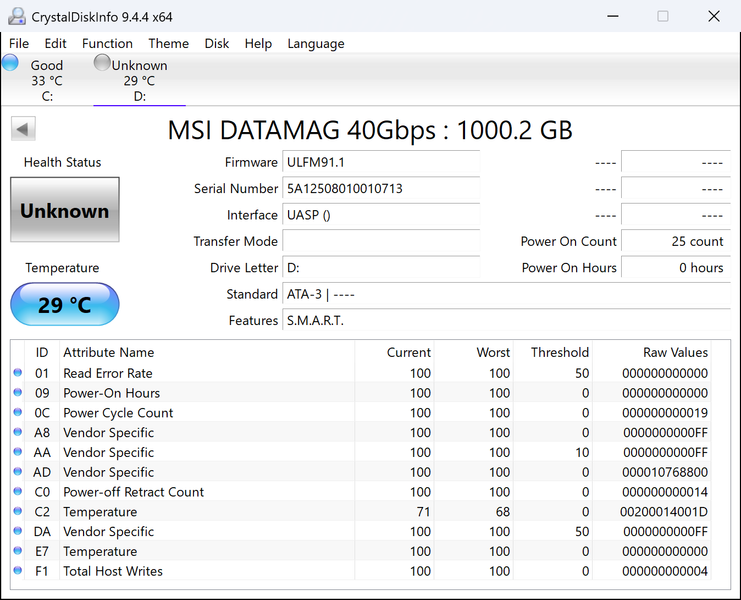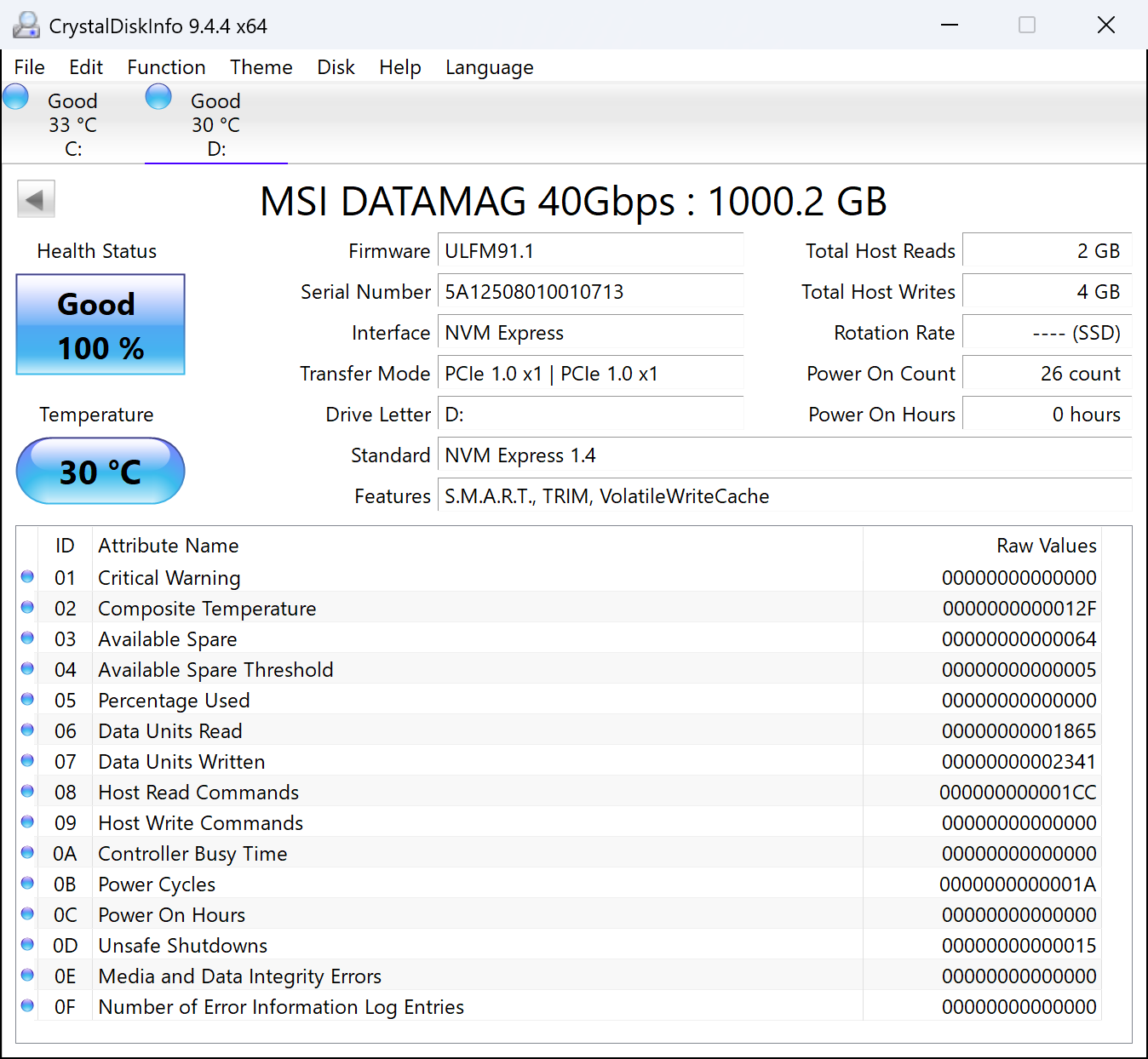 Полноценно всё работает с USB4, где используется стандартный NVMe-протокол. Соответственно, и SMART будет таким же, как у внутренних SSD с поддержкой NVMe 1.4, так что смотреть его стоит более подходящими утилитами — CDI на самом деле закостенел во времена версии 1.0, хоть формально и обновляется. Впрочем, основные параметры с тех пор не менялись. Для пользователя же такая стандартизация протоколов дает не только стандартные же параметры жизнедеятельности, но и уменьшение задержек, то есть ускорение сценариев, более сложных чем простое копирование информации. Насколько этот эффект весом — покажут тесты.