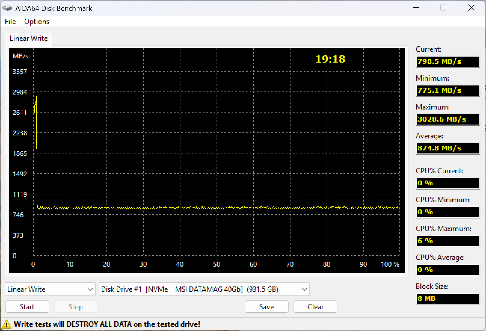 Первый и второй прогоны теста последовательной записи в AIDA64 показывают, что подход к кэшированию остался тем же, что и в Phison U17 / U18. Кэш здесь маленький фиксированный на 50 ГБ (по сравнению с предыдущим поколением контроллеров размер удвоился) вне зависимости от емкости накопителя и количества свободного места, но полностью статическим он не является. При этом прямой записи в TLC-массив как не было, так и нет — все данные проходят через кэш. Процедура очистки-заполнения которого относительно быстрая, но порядка 800 МБ/с, естественно, способны уложиться и в рамки USB 3.2 Gen2. Впрочем, предыдущие контроллеры при такой емкости «выжимали» лишь примерно 500 МБ/с, так что и в этом плане прогресс есть, но не пропорциональный удвоению скорости интерфейса. Выйти же за рамки Gen2×2 получается — но только в пределах кэша, а он маленький. Хотя кому как — если за раз не оперировать порциями информации больше 30—50 ГБ, то всё будет очень быстро. Проблема в том, что такие количества данных сравнительно быстро проскочат через любой интерфейс, так что незачем и гоняться за самым быстрым. А если нужно писать данные сотнями гигабайт, то самый быстрый в таком исполнении может оказаться и медленнее медленных. Именно поэтому мы пока не видим большого смысла сравнивать накопитель с другими устройствами, поскольку самосбор под USB4, естественно, подбирали сами в расчете на более высокие скорости, а сравнение с уже протестированными флэшками и не только на SM232x не совсем корректно: сильные и слабые места у этих платформ разные.