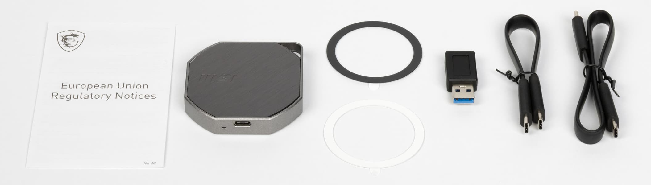 Комплект поставки исчерпывающий. Кроме упомянутых колец для лишенных штатного MagSafe устройств, в нем нашлось место и для двух USB-кабелей: подлиннее (примерно 30 см) и покороче (около 17 см). Второй явно предназначен для использования вместе с телефоном, так что мы предпочли бы еще покороче сантиметров так на 10. Впрочем, никто не мешает озаботиться кабелем любой длины самостоятельно. В том числе — и для подключения к устаревшим портам. Впрочем, для этого MSI вкладывает в комплект переходник, но отдельный кабель удобнее. Возможно, и более длинный — всё равно через Type-A больше 10 Гбит/с не пролазит, так что требования к качеству кабелей в таких режимах пониже.