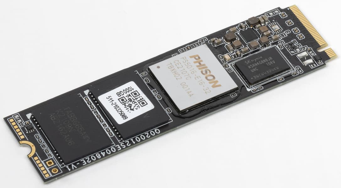 Это уже накопитель существенно более высокого класса — здесь восьмиканальный Phison E16 с DRAM-буфером. В принципе — не новинка: подобные SSD появились чуть больше двух лет назад и стали первыми устройствами, поддерживающими PCIe Gen4. В этом качестве оказались временными решениями — после вала новых контроллеров в прошлом году, на роль топовых устройств претендовать уже не могут. С другой стороны, если внимательно присмотреться к рынку Gen4 SSD, то среди новинок мы найдем не только более быстрые устройства — но и намного более медленные. А еще такой накопитель может быть интересен и при отсутствии в системе поддержки «модного» интерфейса, поскольку во многих сценариях и в неудобном положении будет быстрее немалого количества накопителей, изначально рассчитанных под Gen3. Некоторые новинки, впрочем, и на старых системах могут выжать больше — но стоят для такого применения слишком дорого. Так что и сегодня есть ниша для Е16 — равно как она есть даже и для более старого Phison E12. А мы по новой методике тестировали только SSD на этом контроллере с 2 ТБ памяти — так что этот пробел стоит закрыть. Благо тут конкретные марки вообще не имеют значения: если Е12 встречался и встречается с самой разной памятью, да еще и емкость DRAM часто разная, причем и E18 есть как минимум в двух очень разных модификациях, а про бюджетные модели на том же Е13Т и говорить не приходится, то с Е16 — все очень просто. Во всех моделях на 1 ТБ 32 кристалла 96-слойной флэш-памяти BiCS4 3D TLC NAND Kioxia по 256 Гбит и два чипа DDR4L-1600 по 512 МБ, т. е. гигабайт на шине 16 бит.