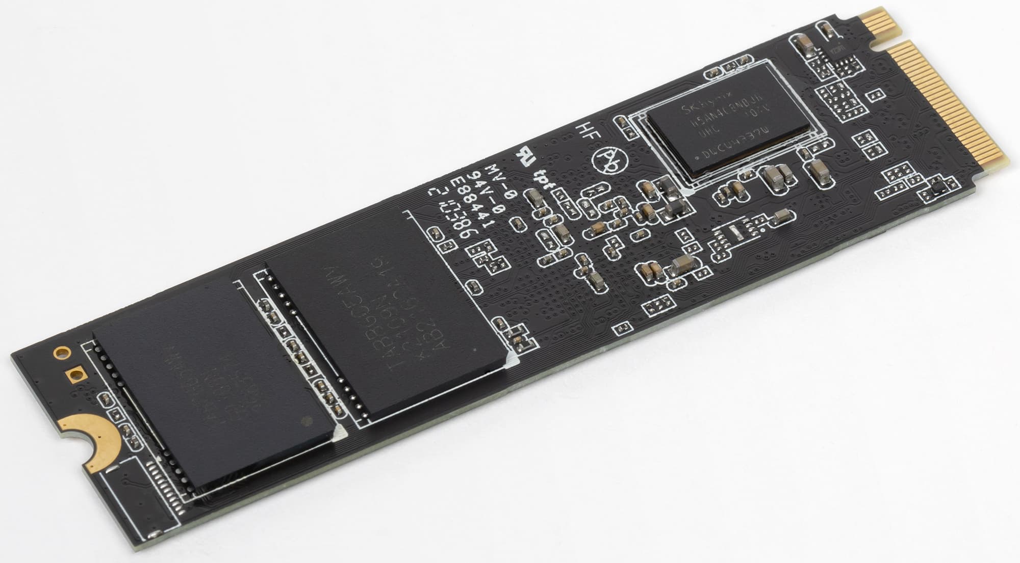Если снять наклейки (что официально ведет к потере гарантии, но нам — можно :)), то потом очень сложно вспомнить — что именно на них было написано. Типичные платки черного или синего цвета (первый чаще всего встречается в более дорогих моделях, хотя это может быть и просто совпадением — но не факт), двухсторонний монтаж... даже производитель DRAM как правило один и тот же SK Hynix. В общем, выбирать тут нужно только по цене или отношению к конкретному бренду — работают все одинаково и условия гарантии тоже одинаковые, поскольку «стандартизованы» Phison. Разве что реализация ее в случае чего может быть разной — кого-то и на месте обслужат в сервисном центре производителя, а что-то придется для замены отправлять за границу (хотя «стандартный» вариант с обращением в магазин в любом случае никто не отменял), но это уже отдельный разговор. Работают же все почти одинаково — настройки SLC-кэширования бывают разными. У кого-то буфер на треть свободной емкости — но за его пределами скорость падает ниже 600 МБ/с. У кого-то размер буфера уменьшен — зато на остальном объеме накопитель пишет уже под гигабайт в секунду.