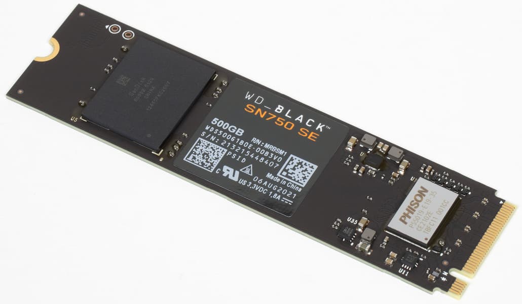 Визуально, впрочем, знакомиться почти не с чем — все SSD на базе четырехканальных контроллеров Phison выглядят практически одинаково. Единственным исключением можно считать упомянутый WD Black SN750 SE — компания упаковывает всю флэш-память своего производства независимо от общей емкости в одну микросхему, как и в полностью собственных разработках линеек Green и Blue. Остальные производители настолько плотную упаковку не используют — она стоит пока еще дороговато. Да и не нужна в моделях этого уровня, поскольку и при сохранении одностороннего дизайна (что важно) на плату M.2 2280 Phison E13T помещался вместе с четырьмя микросхемами памяти.