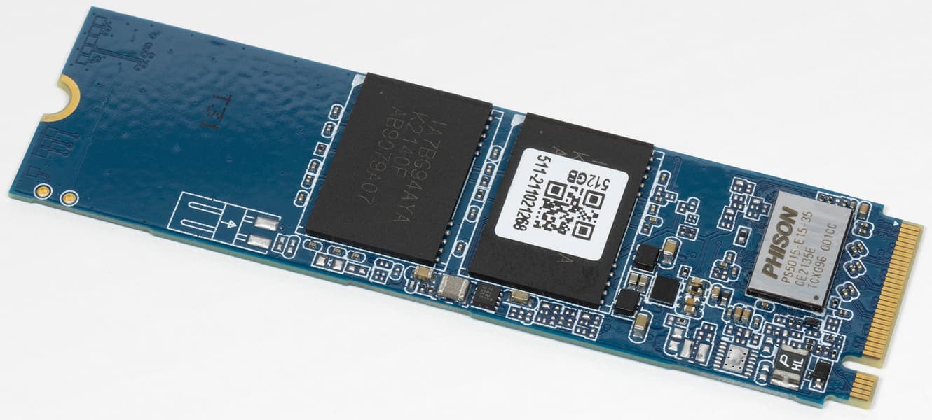 Но платы M390 и M450 (одинаковые, поскольку, что естественно, Phison E15T и E19T имеют идентичную разводку) рассчитаны на две микросхемы памяти. Место для еще двух в этом дизайне Phison предусмотрено на обратной стороне, но пригодиться это уже может лишь для модели, емкостью 2 ТБ на TLC или 4 ТБ QLC — чему в бюджетном сегменте пока делать нечего. Сама память будет стоить достаточно дорого, чтобы исчез смысл в экономии на контроллере — только и всего. Поэтому MSI в обеих упомянутых моделях ограничивается 1 ТБ, мы же вообще решили волевым решением опустить планку до 500 ГБ. По той же причине — даже терабайт это все еще серьезная покупка обычно, так что многие предпочитают в этом случае и контроллер «посерьезнее».