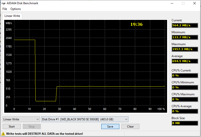 Так выглядит второй прогон без специальной очистки — т. е. когда все ячейки заполнены «мусором» с первого, который нужно расчищать непосредственно перед запись. Хотя и заметно, что статическую часть SLC-кэша контроллер пытается держать наготове всегда, но она маленькая, так что это не слишком помогает. Поэтому режим прямой записи почти на всем объеме и с выдающейся для бюджетного накопителя скоростью. Совсем недавно на такое были способны лишь модели на восьмиканальных контроллерах, но ускорение интерфейса с флэш-памятью позволяет достичь того же уровня и при четырех каналах. Когда память быстрая, конечно — WD Black SN750 SE и тут был раза в полтора медленнее.