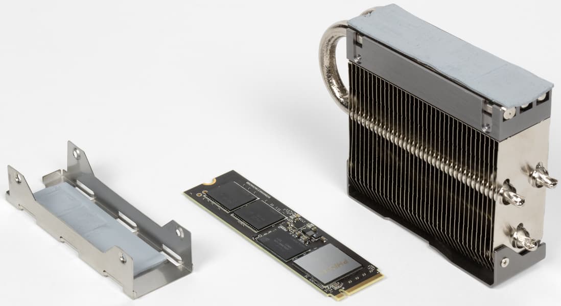 Однако это палка о двух концах. Вообще у радиатора задачи две: сглаживать пики тепловыделения и облегчать рассеивание тепла. Понятно, что с первым массивные конструкции справляются лучше, а со вторым — лучше лишь в идеальных условиях. Если SSD установлен в непродуваемой зоне, рано или поздно под постоянной нагрузкой он всё равно перегреется, разогрев перед этим окружающую среду в тонком слое вокруг себя. Но даже маленький вентилятор непосредственно на радиаторе хоть как-то, но воздух перемешивает, так что в неблагоприятных условиях может оказаться и куда более эффективным. А в благоприятных, как показывает практика, все эти сложные конструкции не являются необходимыми — достаточно будет типичной для многих плат штатной металлической пластинки (при наличии более-менее работающего продува пространства вообще, не обязательно конкретно пространства вокруг SSD). Недостаток же таких массивных систем заключается в том, что в некоторых случаях их установка затруднительна — например, могут мешать радиаторы на плате, просто не рассчитанные на высокие конструкции. Впрочем, иных недостатков у таких «наворотов» нет — они уж точно не хуже более компактных радиаторов. Просто бывает так, что и не лучше. Об этом тоже стоит помнить: массивный радиатор — сам по себе не панацея, и если тепло от него не отводить, то он просто будет чуть дольше прогреваться.