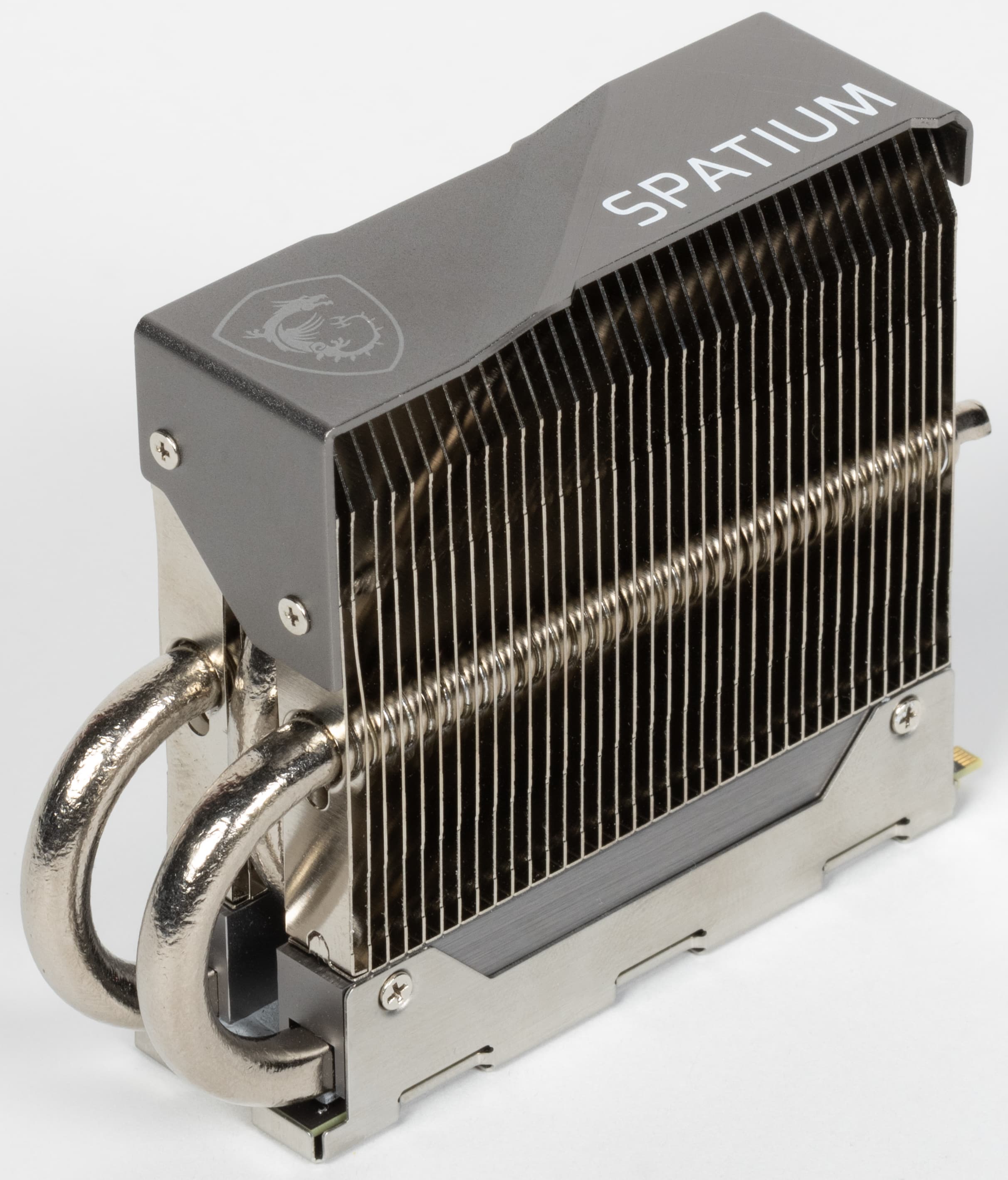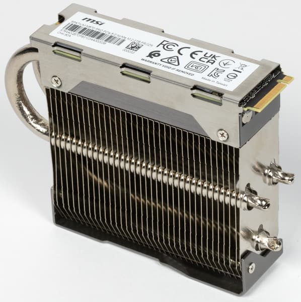 В данном случае лейтмотивом является именно могучий радиатор с двумя тепловыми трубками, на фоне которого сам SSD мгновенно теряется.