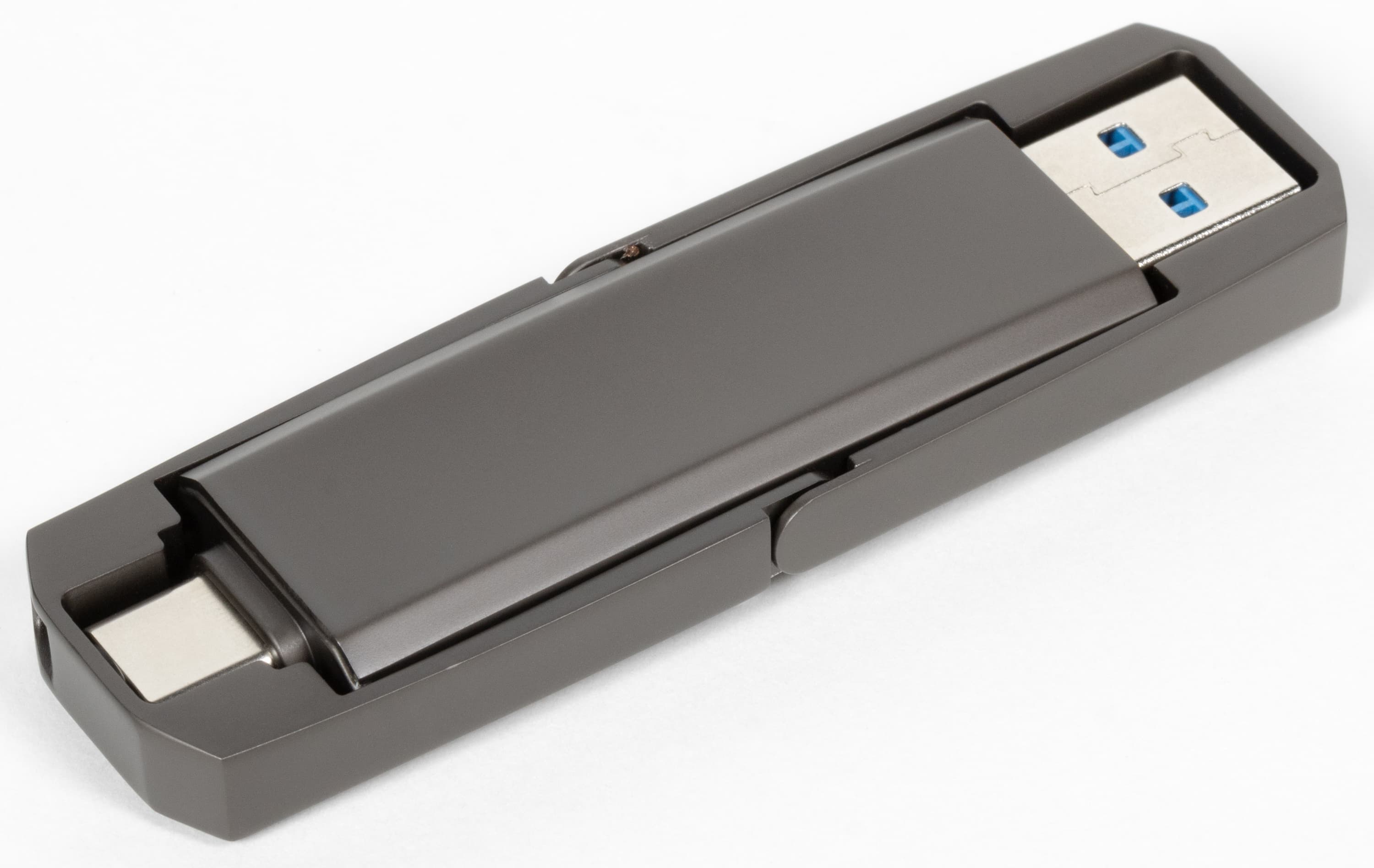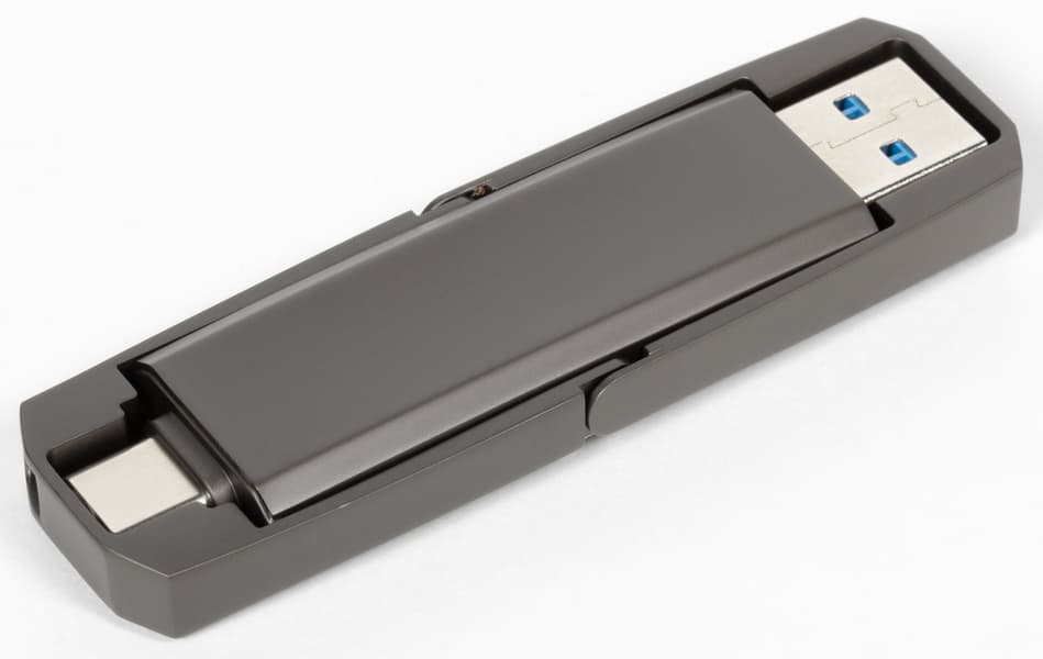 При этом «упаковаться» в габариты флэшки в настоящее время можно и без специальных контроллеров. Пару примеров такого рода мы уже изучали не так давно. В Sonizoon USB3.1 P.SSD было 256 ГБ MLC-памяти с контроллером Silicon Motion SM2246XT и USB-мостом ASMedia ASM235CM. Более дешевый (но и более медленный) Sonizoon USB3.2 T.PSSD содержал то же количество TLC-памяти с контроллером Maxiotek MAS1102 и мост USB—SATA VIA VL715. Но оба упомянутых SSD не слишком отличаются от типовых флэшек: габариты 69×17×7 мм и масса 14 г. И сразу два разъема обоих типов, так что можно обойтись безо всяких кабелей.