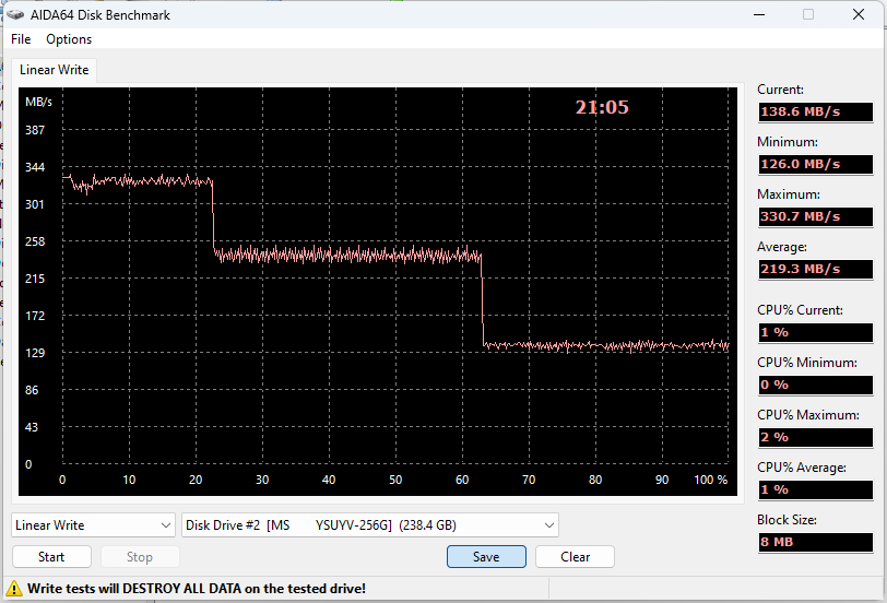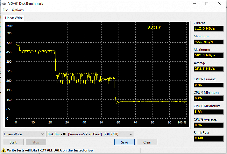 О чем и предупреждали — хоть в устройстве и TLC, а не тормозить при записи больших объемов данных SATA-контроллеры Yeestor или Silicon Motion (очень похожие по повадкам) неспособны, поскольку вся запись идет только через кэш. Под последний отдается всё свободное место, так что до трети такового можно записать быстро — потом начинается унылая работа по разгребанию ранее записанного с параллельным приемом новых данных. Работа через USB трудности усугубляет, так что мучиться приходится на скоростях порядка 30 МБ/с. В общем, в USB 2.0 бы уложилось.