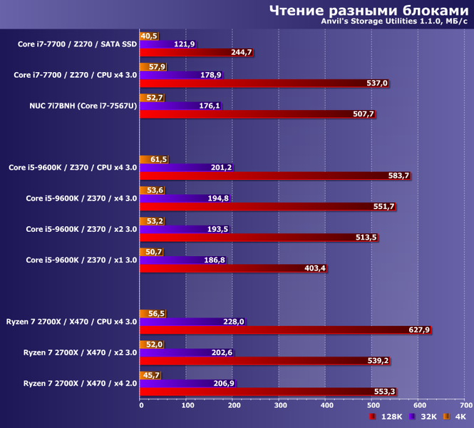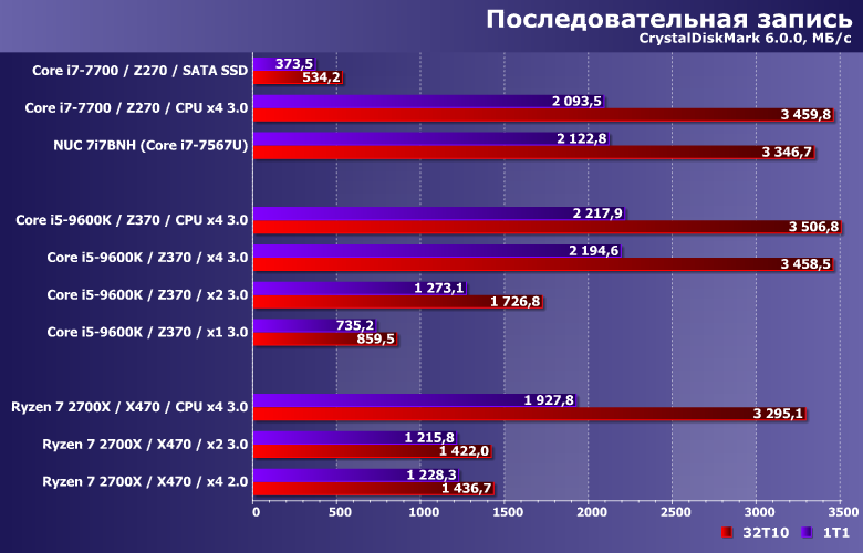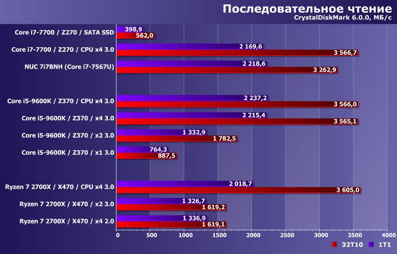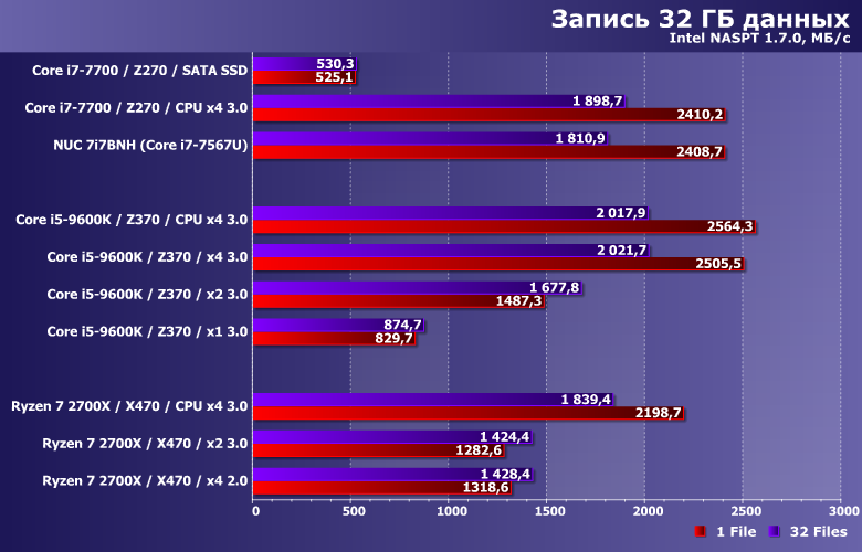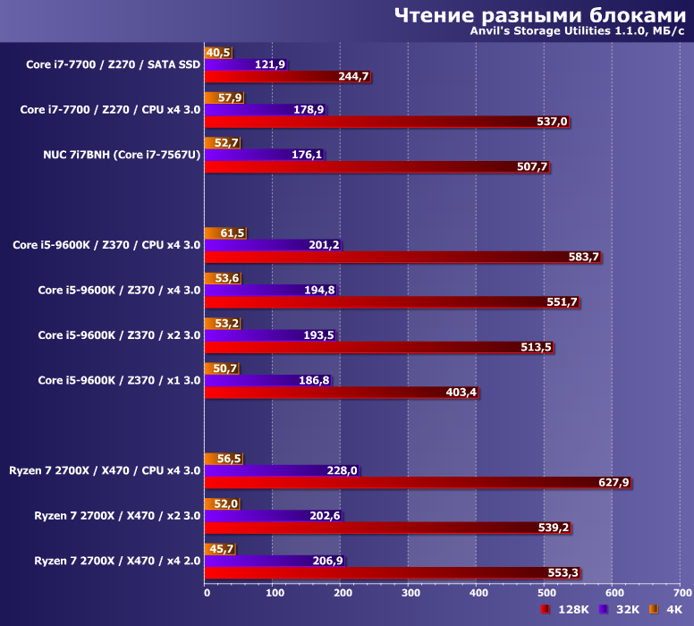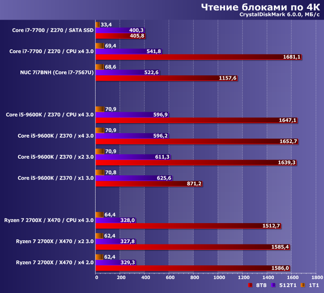 Просто все это следует учитывать, в том числе и читая обзоры, дабы не удивляться, что на вашей системе результаты получаются более низкими, чем в наших статьях. Винчестеры-то все равно на чем тестировать, SATA SSD уже некоторую зависимость от тестовой платформы демонстрируют, а накопители с поддержкой протокола NVMe (особенно топовые) вообще очень требовательны к окружению.
