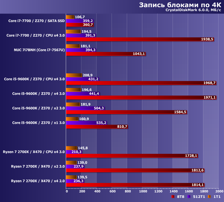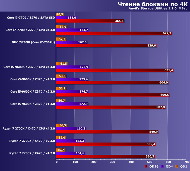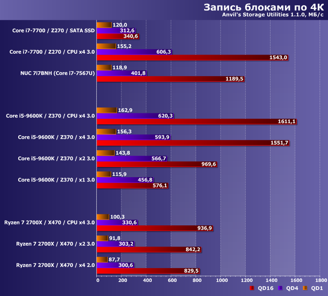 Эта утилита идеологически тестирует тоже самое, но в других режимах — с более короткими очередями (что несколько ближе к практике). Но и в ней, как видим, далеко не всегда можно прямо соотнести производительность собственно с интерфейсом — реализация контроллера важнее. К примеру, на АМ4 производительность на коротких очередях при записи существенно ниже максимальной для данного накопителя, так что и влияние ширины PCIe обнаружить сложно. На Z370 же хватает и очереди в 16 команд, чтобы «маловато» оказалось не только PCIe 3.0 х1, но и х2. Но опять — при мощном процессоре, поскольку в NUC x4 ненамного-то быстрее десктопного x2 (да и того, что обеспечивает AMD в любом из протестированных режиме).