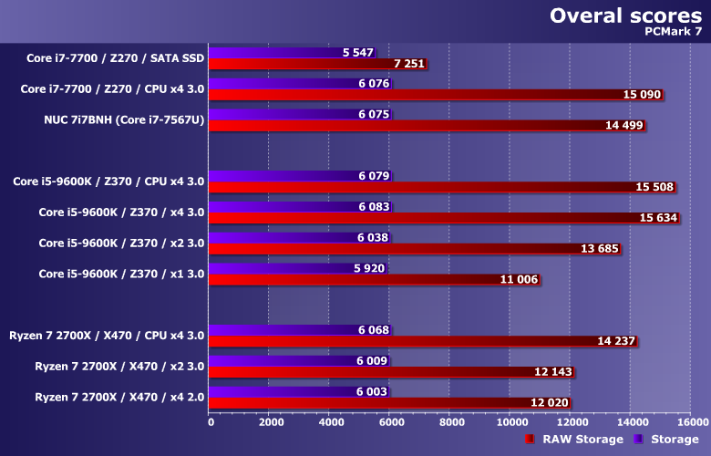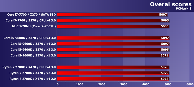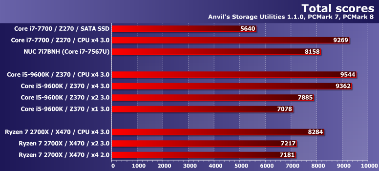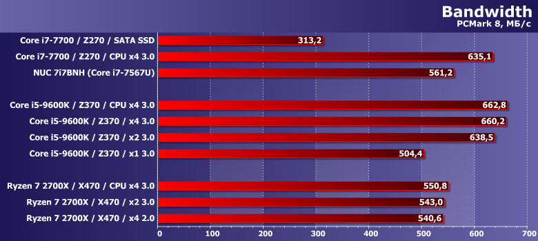 Предыдущая версия пакета традиционно демонстрирует сходные результаты. Правда нагрузки в ней более «легкие», так что большая пропускная способность может пригодиться чаще: в результате уже и PCIe 3.0 x2 на Z370 отстает от PCIe 3.0 x4 в NUC или на АМ4, хотя в PC Mark 8 было не так.