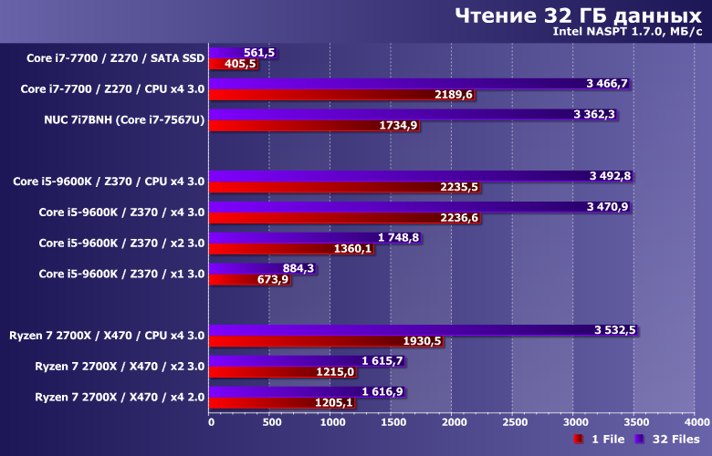 Впрочем, при наличии только одного SSD можно пока считать все платформы эквивалентными и достаточными. Внедрение PCIe 4.0 может дать своеобразную фору AMD, поскольку Ryzen следующего поколения будут первыми устройствами на рынке, снабженными поддержкой этого стандарта. Будет ли эта версия стандарта использоваться и для «накопительного» интерфейса, а также получится ли воспользоваться новыми возможностями в существующих платах для АМ4 — покажет время. Пока ничего точно сказать нельзя, ибо продуктов, рассчитанных на PCIe 4.0, в продаже еще нет.