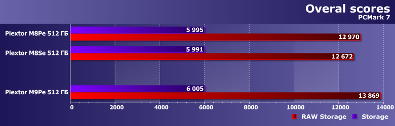 Как уже не раз было сказано, в тестах высокого уровня даже накопители разных классов ведут себя сходным образом, так что обратить внимание стоит лишь на одну деталь: если M8Se отставал от M8Pe (что немудрено), то M9Pe уже обгоняет обоих. Разница, впрочем, во всех случаях микроскопическая, и заметить ее можно лишь в тестовых утилитах — но это вообще обычное дело для большинства скоростных испытаний твердотельных накопителей.