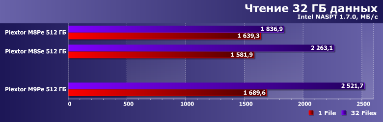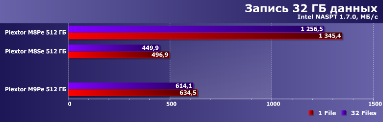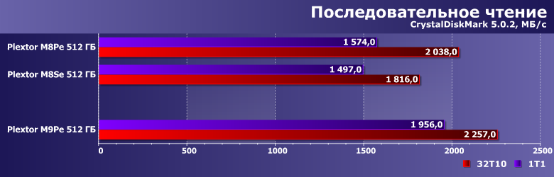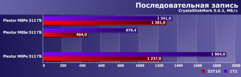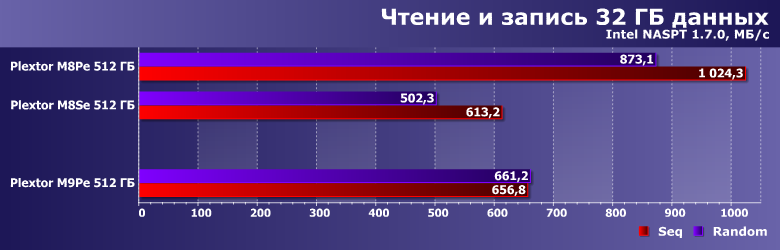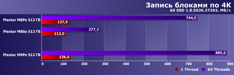 Учитывая доработки firmware за время использования контроллера, невосприимчивость этих сценариев к типу памяти (MLC или TLC) и увеличение скорости работы новых микросхем, уже отмеченное выше, нет ничего удивительного, что в этой паре тестов M9Pe оказался лучшим из трех накопителей Plextor.