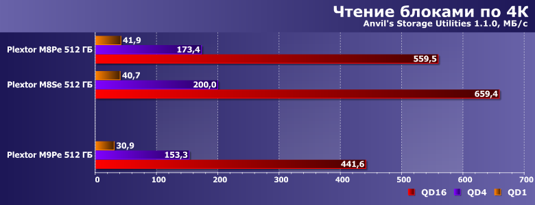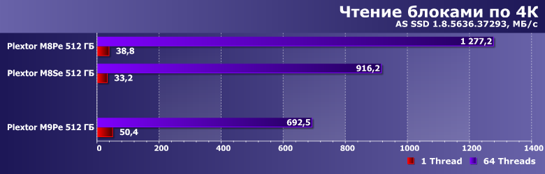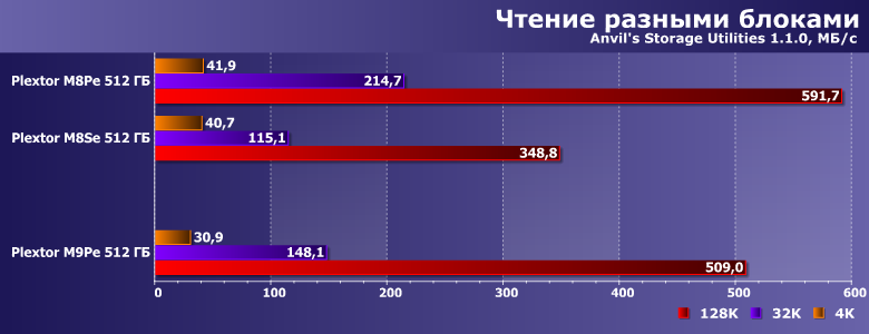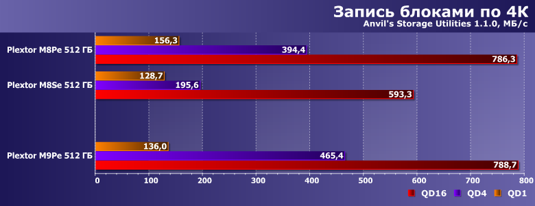 С другой стороны, чтение блоками разного размера с единичной очередью M9Pe выполняет несколько медленнее, чем M8Pe, хоть и быстрее, чем M8Se. Это несколько расходится с показаниями бенчмарков высокого уровня, которые обычно с этим тестом неплохо коррелируют, но просто прикладному ПО достаточно и меньших скоростей.