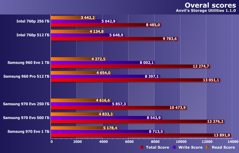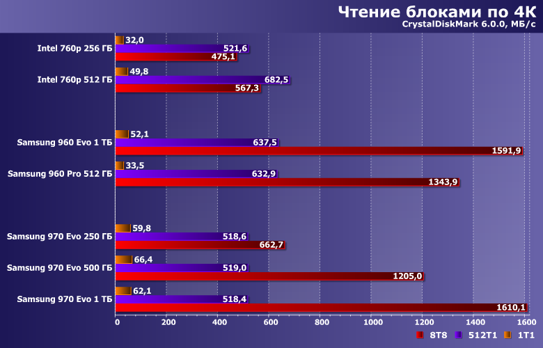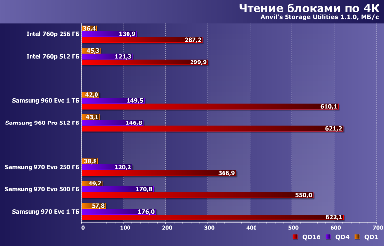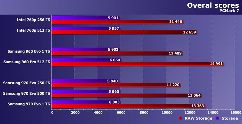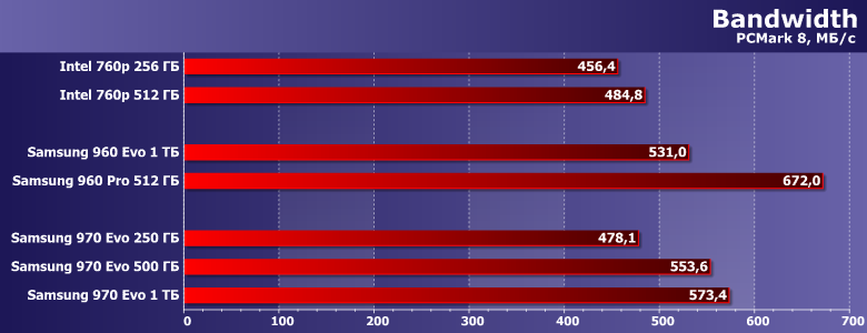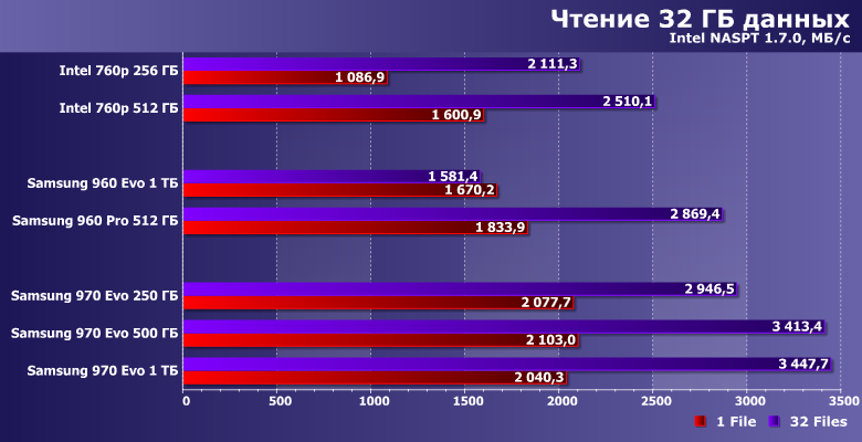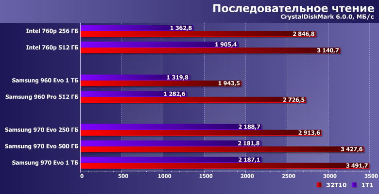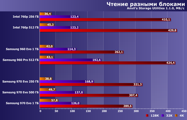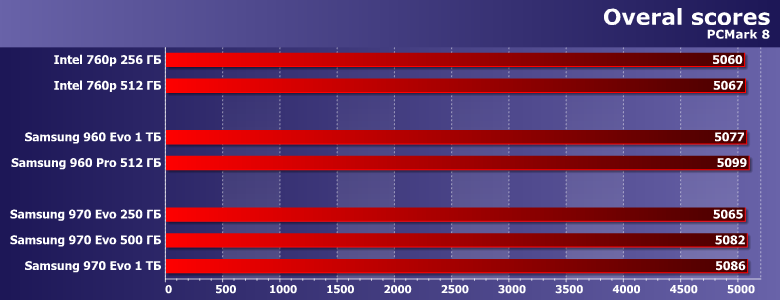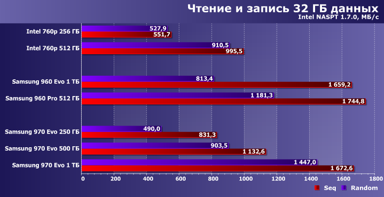 | Intel 760p 256 ГБ | Intel 760p 512 ГБ | Samsung 970 Evo 250 ГБ | Samsung 970 Evo 500 ГБ | Samsung 970 Evo 1 ТБ | Samsung 960 Evo 1 ТБ | Samsung 960 Pro 512 ГБ |