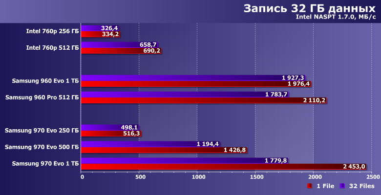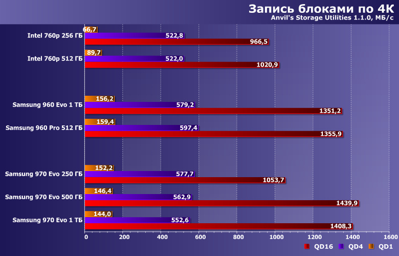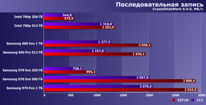 С записью ситуация чуть сложнее, поскольку тут уже не всегда хватает емкости SLC-кэша. Впрочем, в таком положении все устройства этого класса. И в нем 970 Evo сохраняет звание «первого среди равных».