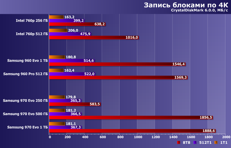 При записи в очередной раз наблюдаем высокую эффективность SLC-кэширования в моделях высокой емкости — что, в общем-то, было присуще и 960 Evo. Самый маленький же представитель новой линейки, как и ожидалось, рекордов не демонстрирует, но «держится» на нормальном для данного сегмента рынка уровне. Пусть таковой и сам по себе не слишком высок.