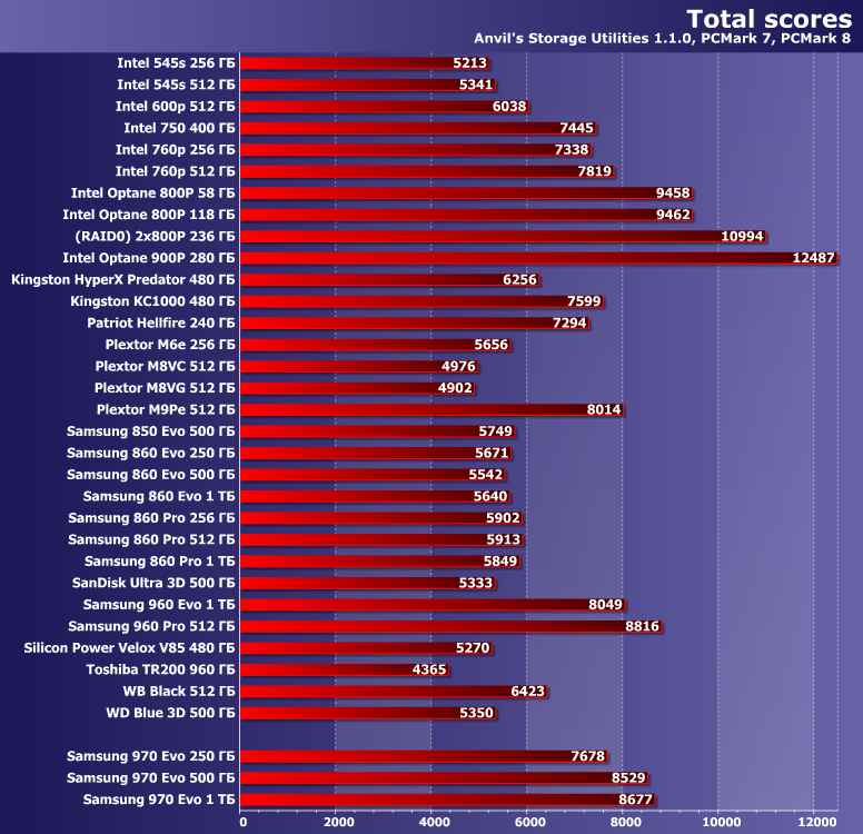 То же самое касается и обобщенного рейтинга — по которому 970 Evo 250 ГБ сопоставим со многими моделями на полтерабайта, а модель на 500 ГБ всех их обгоняет. 970 Evo 1 ТБ не сильно быстрее, но при его емкости это уже не имеет большого значения :)