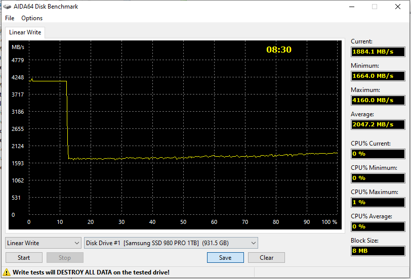При этом собственные характеристики памяти Samsung до сих пор остаются на очень хорошем уровне. Это прекрасно показывают тесты «перезаписи по мусору», то есть второй прогон в той же AIDA64. На деле Micron B47R может и больше — но эта память существует только в виде кристаллов по 512 Гбит, так что для «больше» нужен SSD на 2 ТБ. А 2 ГБ/с для терабайтника — хороший результат. Которого Samsung достиг еще в 2020 году — остальные подтянулись позднее. Но к настоящему моменту подтянулись.