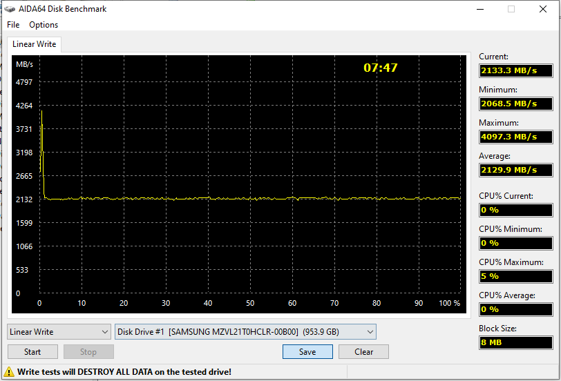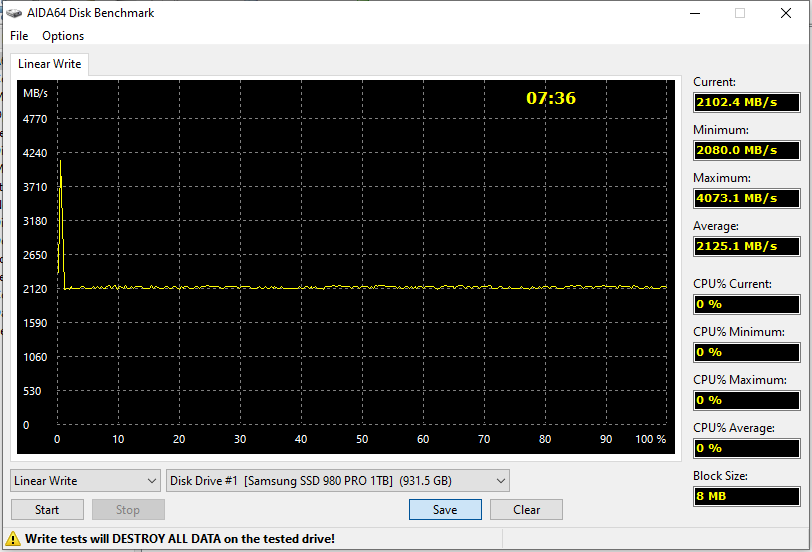 Начнем с традиционного теста полной прописи в AIDA64. Убеждаемся, что как таковой разницы между терабайтными Samsung 980 Pro и PM9A1 нет. Второй затратил на операцию на 10 секунд больше времени — но он, напомним, и на 24 ГБ больше. Впрочем, и расхождения на несколько десятков мегабайт в секунду на всех участках графиков есть тоже, однако на фоне абсолютных значений скоростей это существенного значения не имеет.