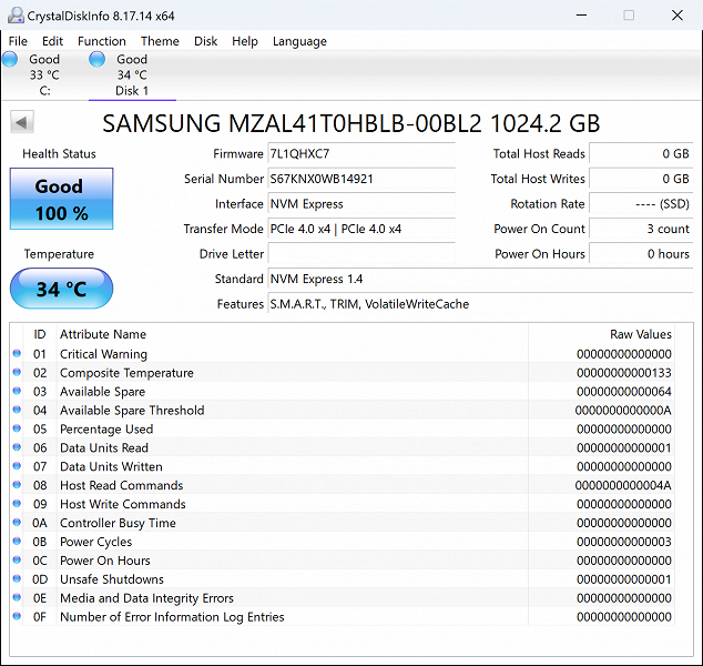 Кстати, еще один момент, по которому контроллер устарел — лишь четыре кристалла на каждый из четырех каналов при емкости каждого дают максимум 1 ТБ. Но Samsung и в более новых линейках, типа PM9C1a, не анонсировал моделей большей емкости. Для самых дорогих ноутбуков всегда был, разве что, PM9A1 на 2 ТБ, к которому недавно добавили PM9F1 — и всё. Массовый покупатель чаще и вовсе получает лишь 512 ГБ, а больше — только самостоятельно заменив комплектный SSD на что-то более приличное. Поэтому, повторимся, и важно знать — что ж там комплектное. Узнаванием и займемся — заранее понимая, что звезд с неба эта модель хватать не может, так что и не будет.