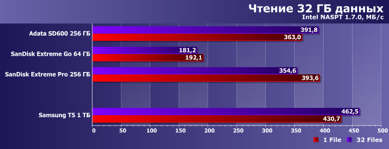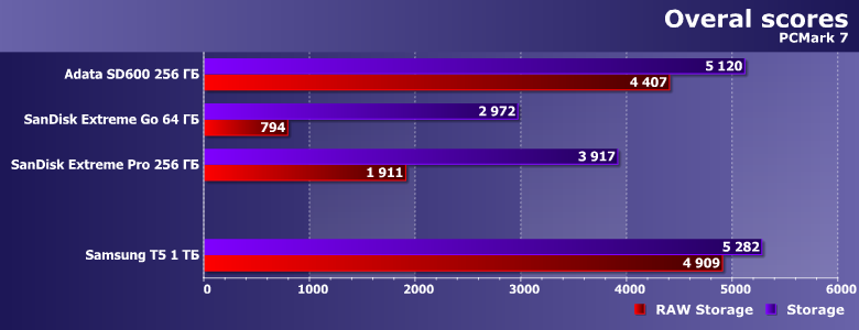 Как мы уже не раз отмечали, с точки зрения тестов высокого уровня значимой разницы между внутренними твердотельными накопителями (причем даже с разным интерфейсом) нет: современному программному обеспечению не просто достаточно любого из них — на деле и самые медленные модели обеспечивают солидный запас производительности. Внешние же накопители подобной «точки насыщения» еще не достигли. Хотя и в рамках одного класса устройств близки к этому: SD600 от T5 отстает не слишком сильно, а вот более компактные накопители (пусть и «экстремально быстрые», но в своей группе) намного медленнее. С другой стороны, так и должно быть — подобные нагрузки давно уже не актуальны для внешних винчестеров, да и для «обычных» флэшек, а вот внешний SSD зачастую как раз и приобретается в расчете в т. ч. и на подобное применение.