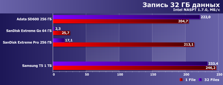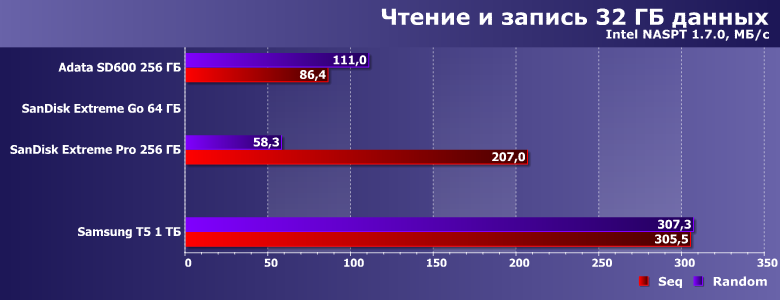 Поскольку некоторое время назад мы меняли тестовый стенд, сравнивать тестируемые устройства особо не с кем — накопление результатов только началось. Да и ранее внешних SSD такой емкости не тестировали, так что в этот раз для сравнения взяли не конкурирующие в прямом смысле слова накопители, а пару быстрых флэшек (SanDisk Extreme Go 64 ГБ и SanDisk Extreme Pro 256 ГБ) и внешний SSD на 256 ГБ (Adata SD600), благо нашлись «под рукой».